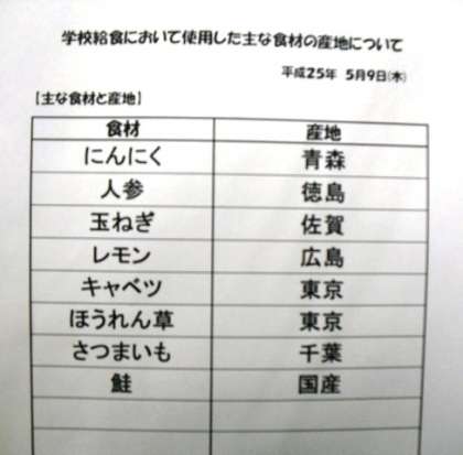 5月9日(木)本日の給食産地