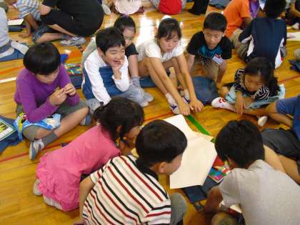 58歳の誕生日を祝って、開校記念集会を開きました。企画代表委員会の主催で行いました。校歌を歌い、学校の歴史に関するクイズをみんなで考えました。「松丘小学校で一番学級数が多かった時は1学年何クラス?」というような質問にみんなが真剣に考えました。次のたてわり班活動では、学校のよいところをあげ、「良い学校にするために取り組むこと」を考えました。「ルールを守る、元気にあいさつをする、廊下を走らないなどなど」色々なことがあげられていました。