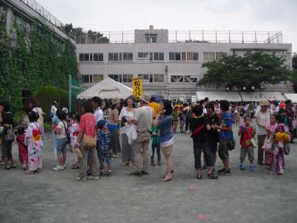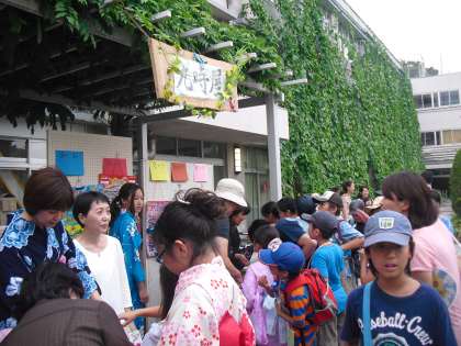 途中、雨が降り、一時中断しましたが、プログラムを少し変更しただけで、実施することができました。金管の演奏、盆踊り、・・・・・そして子どもたちが目を輝かせて並んでいる様々なお店。