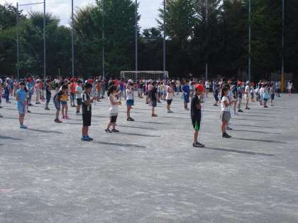 子どもたちの持久力を高めるために、縄跳びの取り組んでいます。今日は、2・4・6年生が体育朝会で短縄をしています。音楽に合わせ、楽しく跳んでいました。縄を片手に持って回す操作をしたり、様々な跳び方を入れたりして音楽がかかっている間跳ぶようにしています。