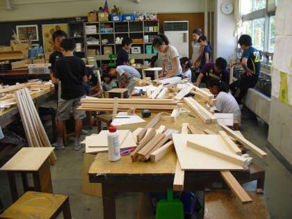 今年度は展覧会の年です。目下、子供たちは作品制作中です。今日は6年生と3年生の授業をのぞいてみました。6年生は、木材と格闘中。設計図をながめながら必死です。「ナイスないす」の作成中です。できあがりを楽しみにしながら、木を切ったり、くっつけたり・・・・さて、どんな椅子ができあがるのでしょうか。小学校の時に作った椅子を大事にしてずっとずっと自分の椅子にできればうれしいですね。