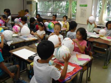 3年生は、風船のまわりに和紙をつけ、そこに素敵な模様をつけていました。図工室に飾ってある風船。そこに模様がつくととても華やかです。子供たちはかなり真剣な顔つきで作業しています。油断したら風船が割れる?そんなドキドキも味わいながら、作成しています。