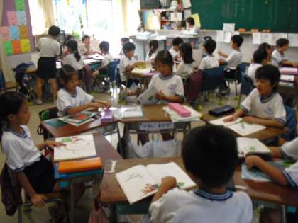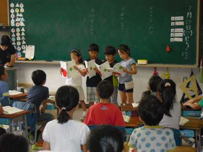 1年生の教室から、「おじいさんがかぶをひっぱって」という元気のよい声がきこえてきました。おもわず教室へ入りますと、音読発表に向けての練習をしていました。おじいさんがひっぱてもぬけない、おばあさんを呼んできてもぬけない、そのあとまご、いぬ、ねこ、ねずみ、とどんどん引っ張る人が増えていきます。そして、ねずみが加わったところで、「やっとかぶはぬけました」となります。