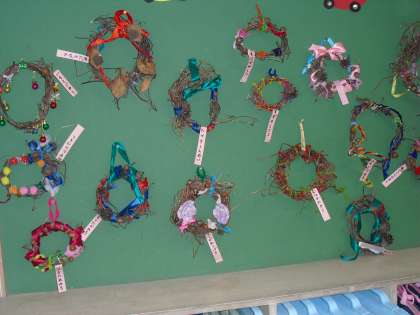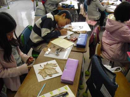 1年生、2年生はそれぞれ、秋探しに出かけました。馬事公苑へ行った1年生は、そこで見つけた秋のものを使って、クリスマスリースを作成しました。リースのつるは、朝顔のつるを使います。自然のものを使ってとても素敵なリースが出来上がりました。砧公園へ出かけた2年生は、見つけた秋にものを使って、自分の思い描くことを表現しています。紙の上にどんぐりや、落ち葉をはりながらそこにイメージする自分なりの世界を表現していました。