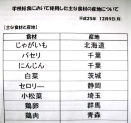12月9日(月)本日の給食産地