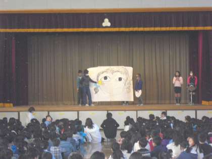 松丘小学校では、集会で福笑いをしました。目、鼻、口などのパーツをどこにおくか、会場の子供たちの指示で場所を決めます。会場の子供たちの気持ちが一つになって、福笑いを仕上げていました。集会委員会の子供たちのアイディアには感心します。