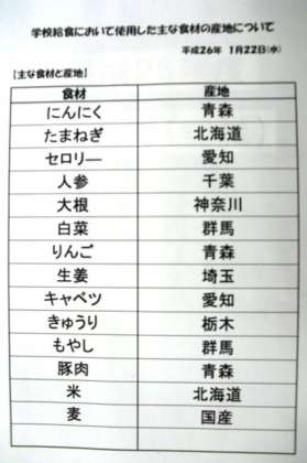 1月22日(水)本日の給食産地