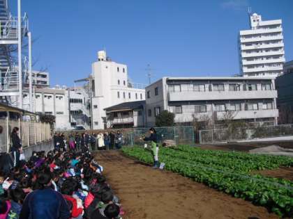 1年生は、近所の農園で小松菜採りを体験しました。指導員さんのリードで「いっぱい抜こう!」「おう!」と張り切って抜き始めました。「あっ、おれちゃった。」「ぬけなあい。」などの声があちこちから聞こえてきました。お手伝いのお母さん方や担任、学校主事などに助けてもらい、そのうちコツをつかむとあれよあれよという間に全部抜き終えました。最後に、指導員さんに、話の聞き方、後始末の仕方をほめていただき、畑を後にしました。