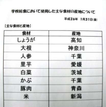 1月31日(金)本日の給食産地