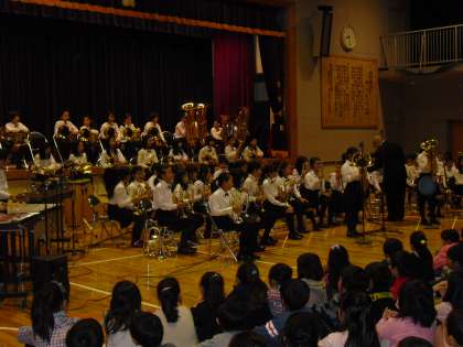 今日は、今週の土曜日に行われる管楽器発表会のリハーサル。全校児童の前で、金管バンドの子どもたちが、15日に発表する曲を演奏しました。