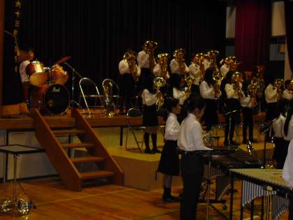 曲目は「ムーンライト・デザート 〜月の砂漠〜」「マンボNO5」です。楽しそうに演奏する子どもたち。今日までに毎日の朝練習、放課後の練習、土曜日午後の練習、休日の建国記念の日の練習などを重ね、がんばっています。演奏が終わったときの子どもの笑顔がとても素敵です。