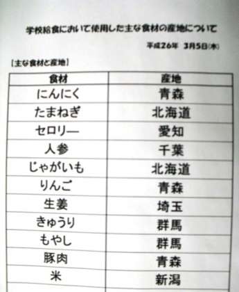 3月6日(木)本日の給食産地