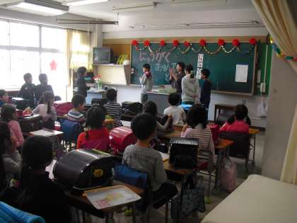6年生が1年生の教室へ行き、朝の時間、いろいろな面倒をみることになっています。6年生にとってもこの活動は、最高学年としての自覚を養うことになりますし、1年生にとっても学校に安心して登校できる支えとなっています。