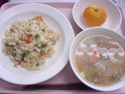 今日の給食「子ぎつねごはん・牛乳・呉汁・冷凍みかん」