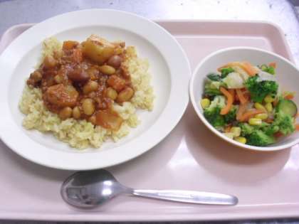 今日の給食「チリビーンズライス・牛乳・はちみつサラダ」