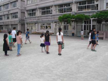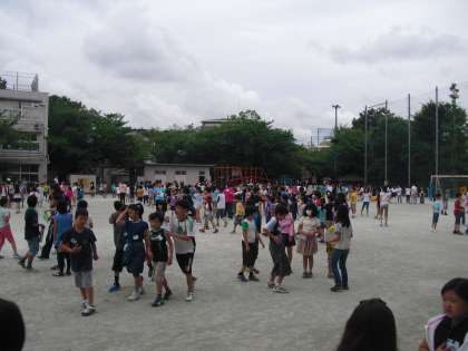 「だるまさんがころんだ」の声で動き始めたグループ。長縄をしているグループ。1年生から6年生までがひとつのグループになって朝のひと時を楽しく過ごしていました。