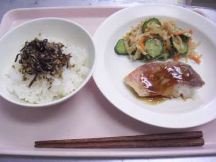 佃煮には炒ったじゃこや胡麻を煮詰めたところに入れているので、また、切干大根のサラダは切干大根が入っているので、どちらも噛みごたえがあるメニューになっています。この二つがかみかみメニューなので、主食と主菜はどちらかと言えばやわらかいメニューになっています。すべてが噛みごたえがあるメニューですと、食べているうちに顎が疲れてしまいます。食感にメリハリをつけることで食べやすい一食を目指しています。