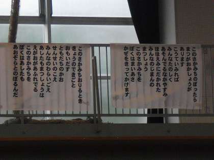 14日は開校記念日です。開校記念集会で歌う「松小坂道」は「学校坂道」の松小版かえ歌です。企画代表委員会の人たちが一生懸命考え、素敵な歌ができあがりました。今朝の音楽朝会では、その歌を全校で歌いました。