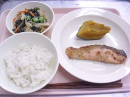 今日の給食「麦ごはん・牛乳・鮭の味噌マヨネーズ焼き・南瓜の含め煮・ねばねばサラダ」