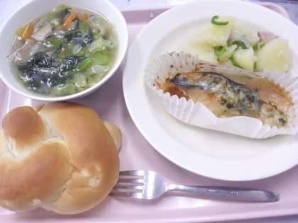 今日の給食「パインパン・牛乳・魚のチーズ焼き・ジャーマンポテト・野菜スープ」