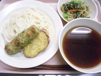 今日の給食「冷やしつけめん・牛乳・てんぷら(いも・ちくわ)・野菜のごまあえ」