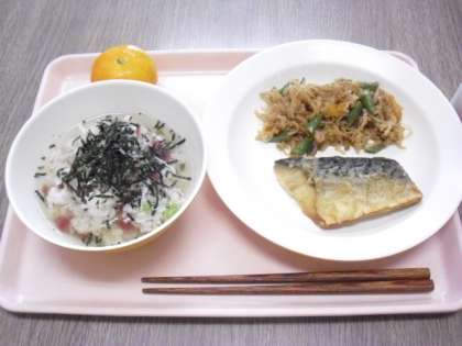 今日の給食「梅茶漬け・牛乳・鯖の塩焼き・切干大根の煮つけ・冷凍みかん」