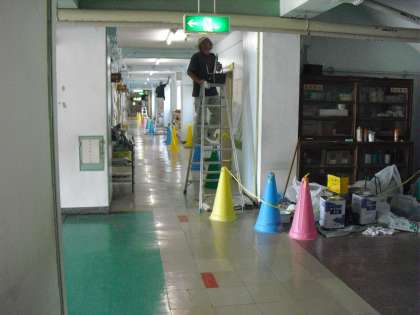1階の廊下の壁をきれいに化粧直しをしています。ほこりを落とし、はがれている部分を平らにし、何回もペンキを塗ってくださっています。この作業は、区の用務班の方々が継続して行っています。