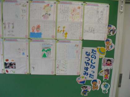 子どもたちの元気な声が学校に戻りました。教室には、夏休み中の学習が掲示されています。また、学年によっては、夏休み中の学習の成果をさっそくテストしています。