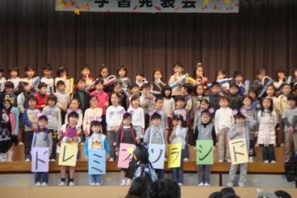 じゃこうねずみの子どもたちは、いつもお母さんのしっぽにつかまる順番を決めるので大さわぎ。みんなで仲良く並ぶ方法を考えます。インフルエンザによる学級崩壊で、練習があまりできなかったのですが、1年生にとって初めての学習発表会、全員で力を合わせて一生懸命頑張りました。