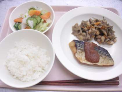 今日の給食「ごはん・牛乳・鯖のピリ辛ソースかけ・刻み昆布の五目煮・野菜の甘酢かけ」