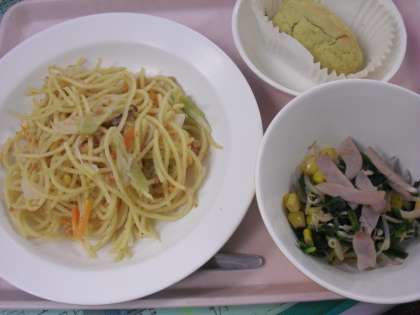 今日の給食「鮭とキャベツのパスタ・牛乳・ホウレン草サラダ・スイートポテト」