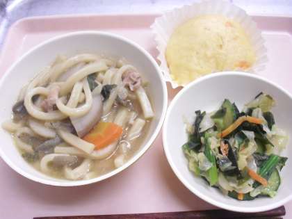 今日の給食「けんちんうどん・牛乳・和風サラダ・キャロット蒸しパン」