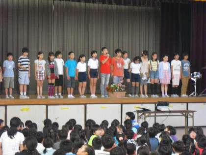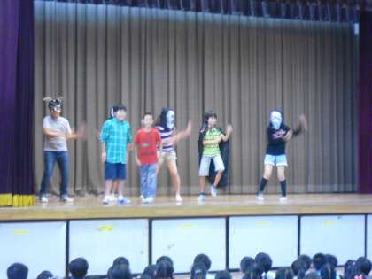 子どもたちは、30秒程度の時間内に自分の学級の店の内容を説明し、アピールしました。替え歌あり、踊りあり、実演なりのなかなか工夫された紹介ができました。子どもたちはこの紹介を見ながら、どこのお店を回ろうかと心を躍らせています。