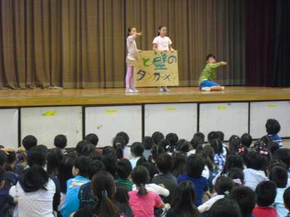 土曜日は子どもたちが楽しみにしている松丘まつりです。今日は、各学級からお店の紹介をする集会がありました。