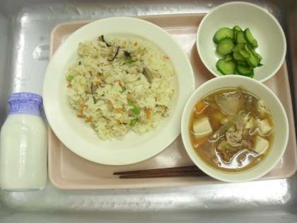 今日の給食「子ぎつねずし・牛乳・さつま汁・きゅうりの甘酢かけ」