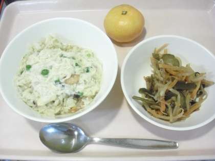 今日の給食「スープチャーハン・牛乳・もやしの中華炒め・みかん」