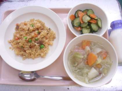 今日の給食「チキンライス・牛乳・ポトフ・ピクルス」