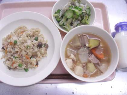 今日の給食「きのこごはん・牛乳・豚汁・野菜のゆかりかけ」