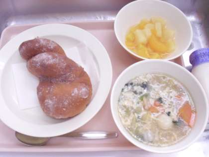 今日の給食「ココア揚げパン・牛乳・白玉スープ・フルーツカクテル」