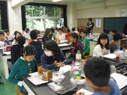 実験中の子どもたちの様子を見ると、目を輝かせ興味をもって取り組んでいます。なぜ?という問いを各自もちながら取り組んでいます。子どもたちの思考力、判断力、表現力を育てる一つの授業です。
