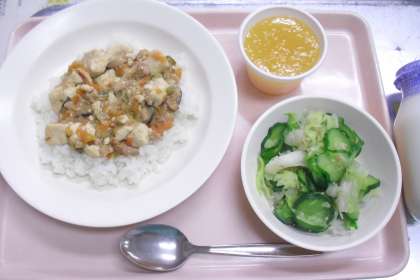 今日の給食「ジャーチャン豆腐丼・牛乳・野菜のごま風味・みかんゼリー」