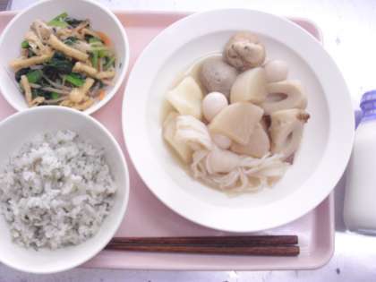 今週は読書週間ですね。献立表でもお伝えしていましたが、今日から本にちなんだ料理を一品給食にだします。最初は「おでんさむらい しらたきのまき」という絵本にちなみしらたきの入ったおでんを作りました。