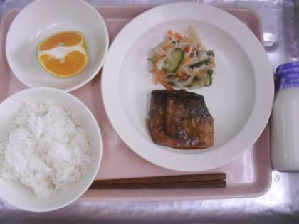 今日の給食「ごはん・牛乳・鯖のみそ煮・はりはり酢の物・早香」