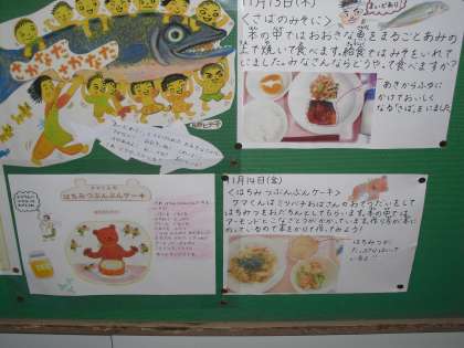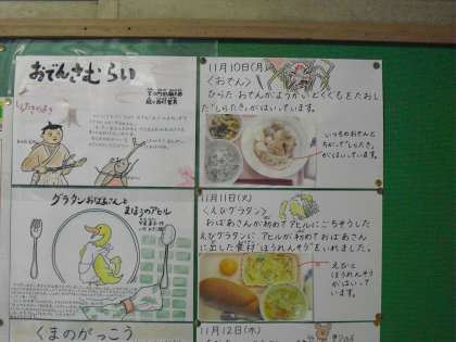 さて、今週は読書週間でした。先生による読み聞かせも取り入れ、とにかく子どもに読書することへの関心をもたせたい、たくさんの本にふれさせたいと願っています。その一つの取り組みとして、本に出てくるメニューを給食の献立に取り入れ子どもに紹介することもしました。今、廊下の食育コーナーには、今週の給食メニューの一品と本の紹介を掲示し、子どもたちの関心をひいています。