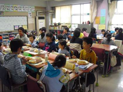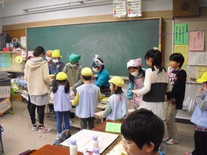 5年生は、並んでいる園児に上手に給食を盛りつけ席へ誘導しています。自分の給食をこぼさないように上手に運んでいる園児たち。