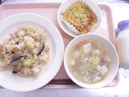 今日の給食「吹き寄せごはん・牛乳・五目卵・豆腐汁」