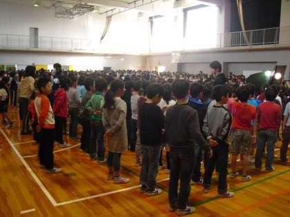 昨日よりは寒さが和らいだ今朝。体育館には元気な歌声が響きました。本来ですと1年生と4年生の発表でしたが、4年生の1学級が学級閉鎖のため、4年生の発表は年明けに行います。今日は1先生の歌の発表でした。