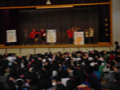 子どもたちはよく見ています。違いをよく見つけています。みんなが舞台上の集会委員会の人たちの演技を一生懸命見ようという気持ちになっています。正解すると大喜び。