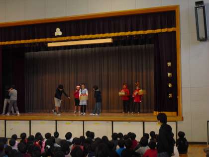 今学期、最後の集会です。今日はクリスマスにちなんで、時をあやつることができるサンタが色々な場面で時を止め、子どもたちにクイズを出していました。クリスマスプレゼントを配っている途中の様々な出来事・・・・