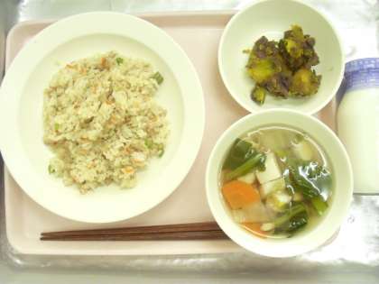 今日の給食「こぎつねごはん・牛乳・白菜と豆腐のおすまし・かぼちゃのいとこ煮」
